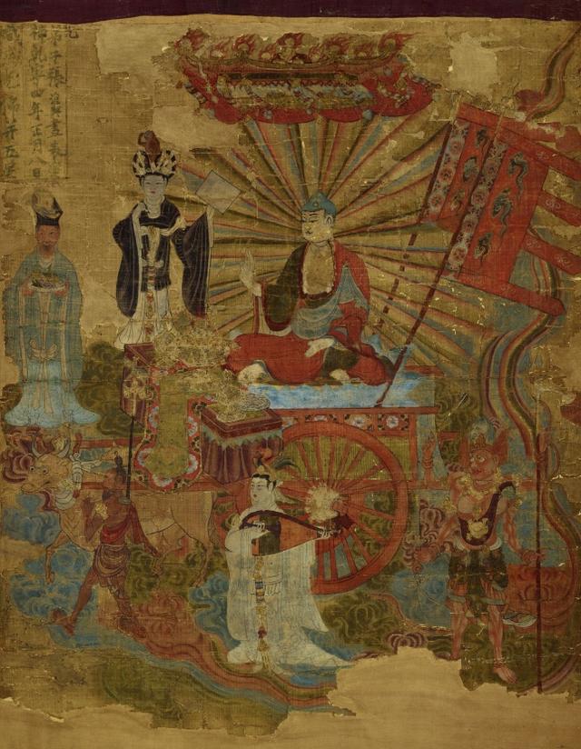 这幅《炽盛光佛及五星图》根据《佛说炽盛光大威德消灾吉祥陀罗尼经》绘制,这一题材的作品最早出现于唐朝,北宋、西夏时期极为流行。主要是信众们用于礼拜,祈求消灾免祸。此图左上角有文字题记: