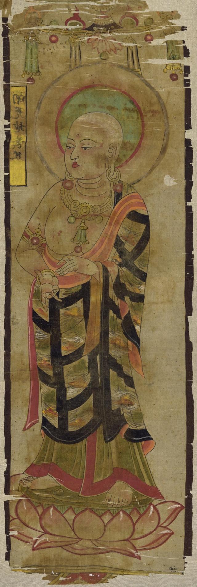 此幅立姿地藏菩萨为比丘相,头顶有华盖,头后有圆形双层头光,赤足踏莲台。他身着偏袒右肩式袈裟,其上的黑色方格尤为醒目。这是表现水田图案的袈裟,叫田相袈裟或田相衣。田相象征田畦贮水,生长嘉苗,以养生命。此袈裟用黑色绘出田相,其间施以绿色线条和红、黄、白色晕染,袈裟边缘和裙摆微微飘动,既表现出衣料的柔软,又营造出行云般的动感。此身地藏菩萨的面容很有特点,面庞圆润,双耳垂肩,五官十分俊美。弯弯柳叶眉下明眸低垂,鼻梁高挺,樱桃小口。面颊、眼窝上胭脂红的晕染和微微鹰钩的鼻尖营造出一种超凡脱俗的异域之美。榜题“南无地藏菩□”文字为反向,是写在绢的背面的,可能画家画完时不小心题在绢的反面了。