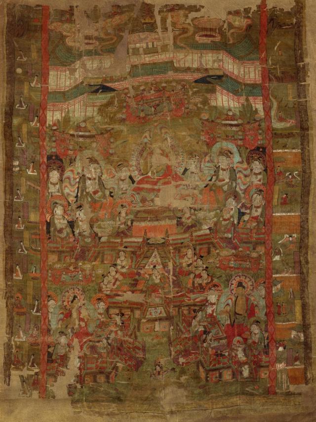 这幅《观无量寿经变》采用唐代流行的三联式构图。中央为净土图,画面右侧绘“未生怨”故事,左侧绘“十六观”内容。