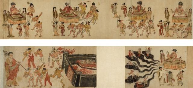 冥府的十王,最初是作为伴随地藏的像来表现的,后来就单独地被作为主体来表现了。此图似未完成,中央部分缺失。现存部分绘十王中的第一殿秦广王至第五殿阎罗王,卷末绘地狱图及地藏菩萨出现。第六殿变成王以后的五个王和地狱图的右半部分沿图卷的接缝处缺失。图中没有任何文字,也许当初绘制时便仅有卷头的题记和题尾,可能未完成。卷中所绘十王均端坐在桌旁,旁有童子侍立,另有手持刑具的典狱或狱卒。十王面前是赤裸身体带着木枷的罪人,及手捧佛像或经卷的善人,手捧佛像或经卷表示皈依佛门之意。第五殿阎罗王图左侧在六条云上绘出六道,自上而下为阿修罗道、天道、人道、畜生道、饿鬼道、地狱道。卷末所绘地狱图右半已失,围墙内床榻上躺着亡者,两侧门柱上有火焰,各蹲坐着一只狗。围墙外的五个亡者被牛头马面驱赶着走向地藏菩萨,表示即使是地狱的亡者,也可以遇到慈悲的地藏菩萨,免除一切苦难。
