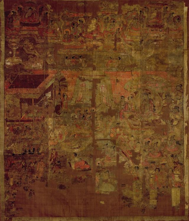这幅《观无量寿经变》采用唐代流行的三联式构图。中央为净土图,画面右侧绘“未生怨”故事,左侧绘“十六观”内容。