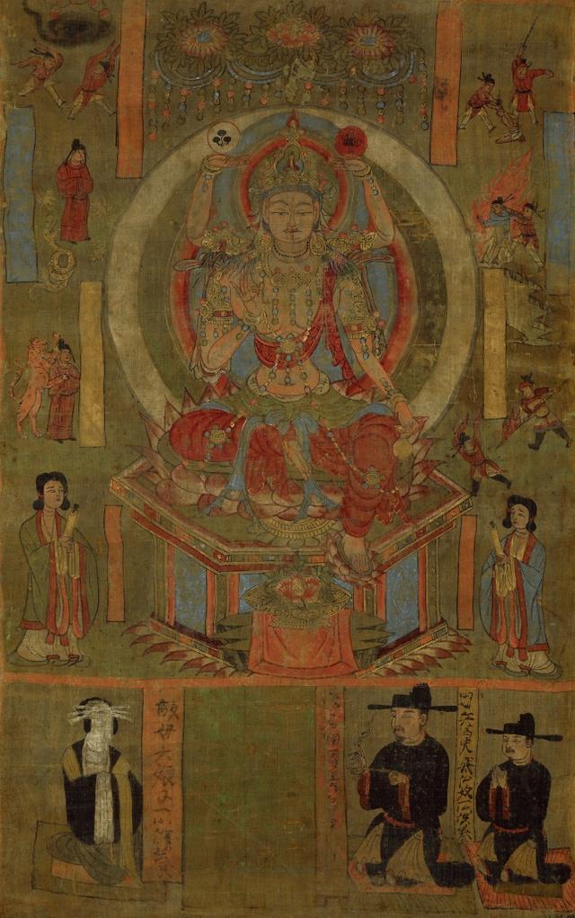 此图表现《观音经》(即《法华经· 观音菩萨普门品》)所记的观音菩萨救苦救难诸内容。画面中心为观世音菩萨坐于六边形台座上,头戴化佛冠,身有四臂,上面二臂分别托日、月,下面一手上举,一手持净瓶。观音菩萨两侧画出六个救难场面,画面右侧为:(1)一犯人跪坐,二刽子手一人持犯人头发,一人举剑欲砍;(2)一人被后一人推向火坑;(3)一人持矛正向另一人刺杀。画面左侧:(1)两人行进中忽遇雷击;(2)一人被毒蛇等物所困;(3)一人被猛兽袭击。佛经中讲,凡遇此等危险,只要口念观音,即可得救。绢画下部绘供养人,右侧二身男供养人,左侧一身女供养人。根据题记可知,最右侧供养人为兵马史张佛奴。前面男子是张佛奴的亡父,左侧女子是其亡母。